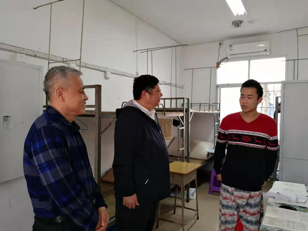 学校防控工作专项领导小组会议结束后,邹书记、毕副校长在党政办、学工部、后勤保障部等部门有关人员的陪同下深入学生宿舍了解学生宿舍假期安全卫生管理及生活服务保障情况,亲切看望了假期留校学生,叮嘱正在复习考研的学生要加强身体锻炼,注重劳逸结合,特别强调要注意做好疫情防护工作,并代表学校向学生及其家长致以春节的问候。