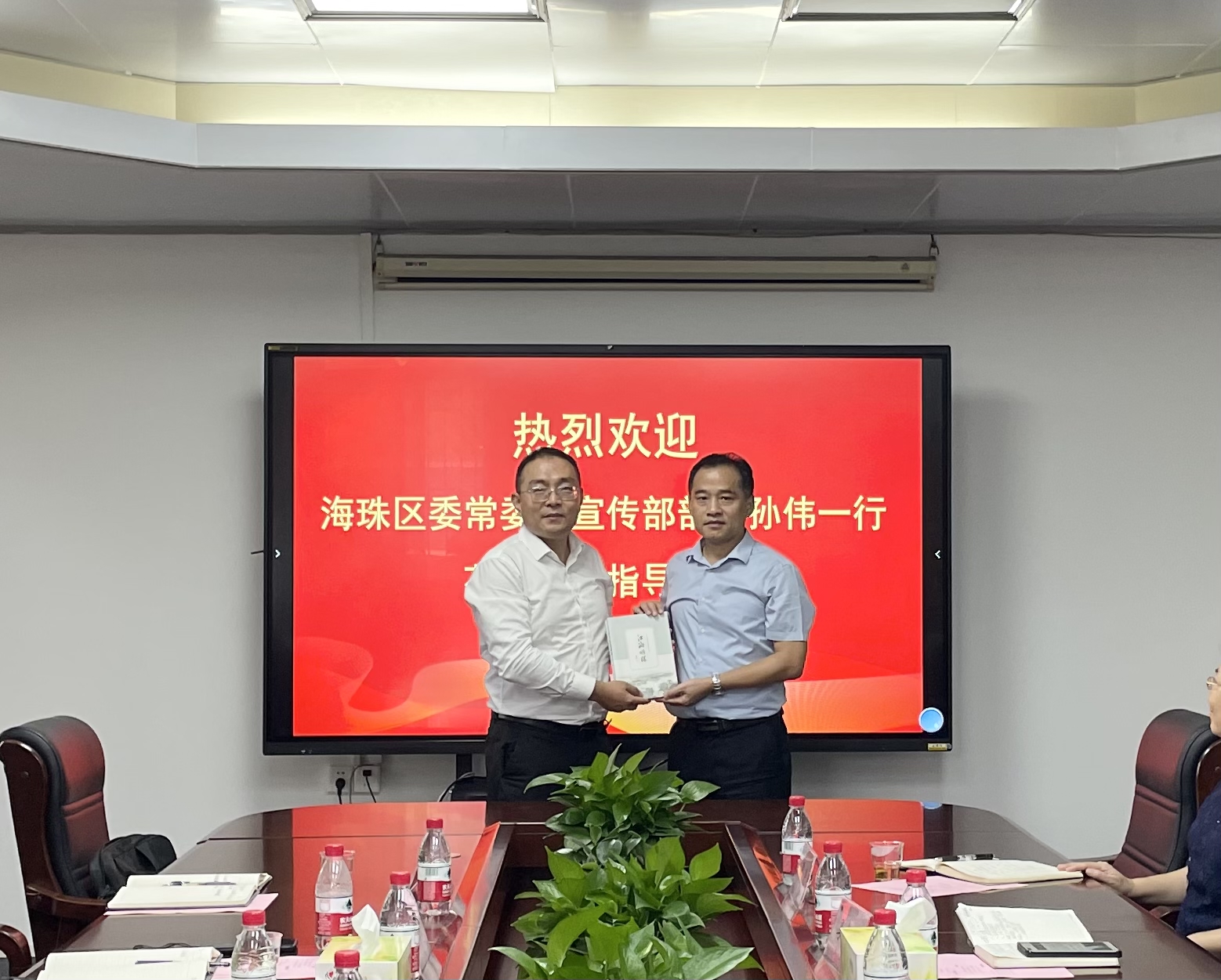 与会双方就如何深化梁诚故居融入凤浦书院、社区与书院共荣共生进行了深入交流,孙伟向陈建平赠送了由中共广州市海珠区委宣传部策划、承载海珠区文化底蕴的书籍——《江海明珠》。