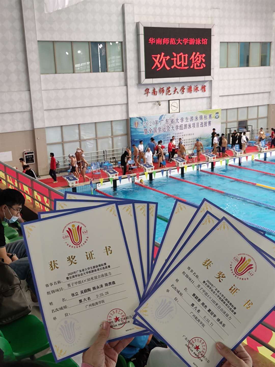 受疫情影响,本次赛事临时定于10月底举行,时间急,赛事近。但在校领导和部门领导统筹安排下,m8810名运动员在古志金、熊庆霞老师的带领下,经过一个多月的集训和准备,在泳道上发挥航海人顽强拼搏精神,最后获得本届锦标赛男子甲组4*100米自由泳接力赛第八名和男子甲组4*50米混合泳接力赛第六名的成绩。