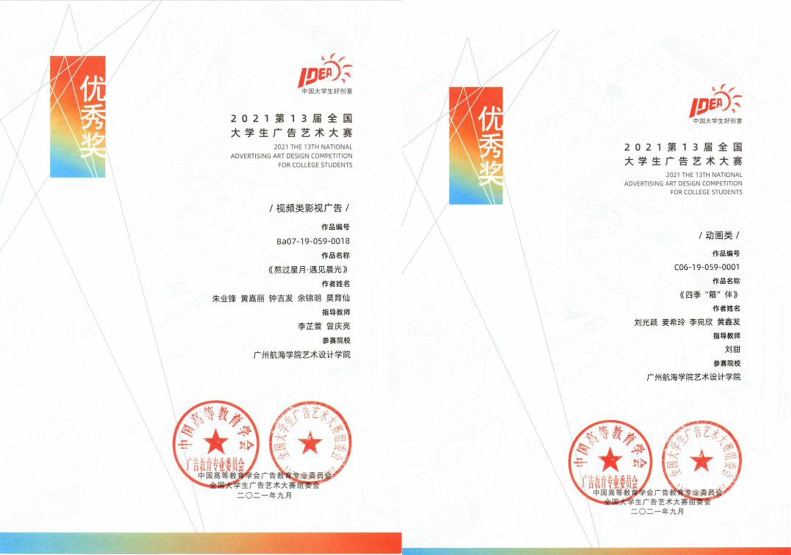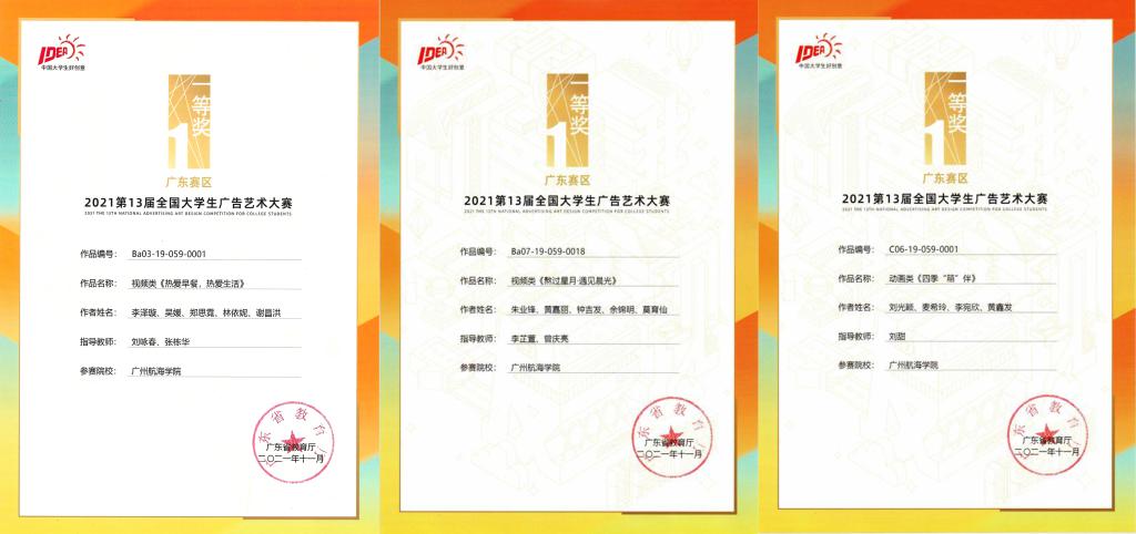 近日,第13届全国大学生广告艺术大赛结果揭晓,艺术设计学院李芷萱、曾庆亮老师指导的作品《熬过星月·遇见晨光》、刘甜老师指导的作品《四季“箱”伴》(复活赛)荣获全国优秀作品奖。此前,由广东省教育厅主办,深圳大学承办的第13届全国大学生广告艺术大赛广东赛区评比中,以上2件作品与学校校电视台刘咏春、张栋华老师指导的作品《热爱早餐,热爱生活》共3件参赛作品荣获广东赛区一等奖,另有1件作品、2件作品分别获省赛二等奖、三等奖。刘咏春、张栋华、李芷萱、曾庆亮、刘甜荣获省赛优秀指导老师荣誉称号。据悉,本次大赛广东省赛264个院系,17000余件作品参赛。