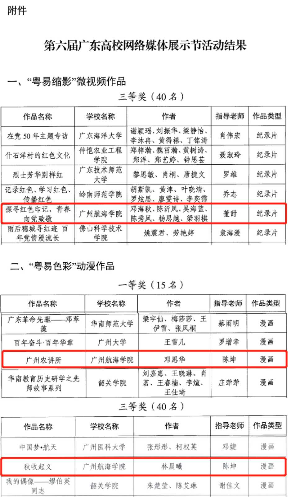 此前,根据《广东省教育厅关于举办第六届广东高校网络媒体展示节的通知》,省教育厅2021年面向全省高校,以“学史立志,知史爱国,明史担责”为主题,组织开展了“粤易缩影”微视频作品、“粤易色彩”动漫作品、“粤易文化”文化宣传作品、“粤易公益”公益广告作品、“粤易乐学”微课程作品等5项展示活动,涌现出一批优秀原创网络文化作品。