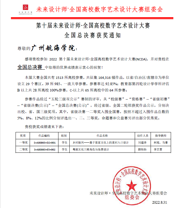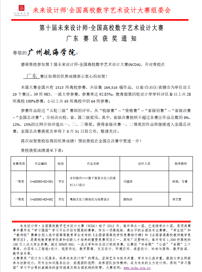 (学工处 供稿)8月31日,由工业和信息化部人才交流中心主办的“2022第十届未来设计师·全国高校数字艺术设计大赛(NCDA)”全国总决赛获奖结果公布,m88喜获全国总决赛一等奖1项、二等奖1项;广东赛区一等奖3项、二等奖5项、三等奖3项。