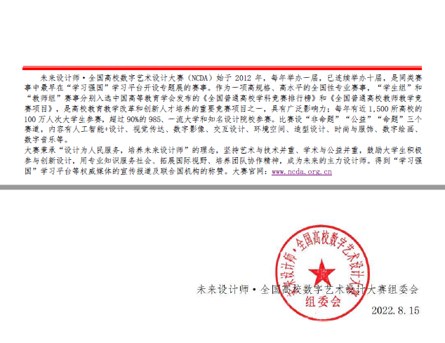 未来设计师•全国高校数字艺术设计大赛(NCDA)始于2012年,每年举办一届,已连续举办九届。作为一项高规格、高水平的全国性专业赛事,NCDA已入选中国高等教育学会发布的《全国普通高校学科竞赛排行榜》,是高校教育教学改革和创新人才培养的重要竞赛项目之一,作为56项顶级全国大学生学科竞赛之一,具有深远的影响力。本届大赛吸引全国1513所高校参赛,共征集164316幅作品,以省、自治区、直辖市为单位设立29个赛区。39所985、一流大学参赛,参赛率达92.85%,教育部第四轮设计学学科评估B以上共28所高校100%参赛,C-以上共65所高校中的64所参赛。