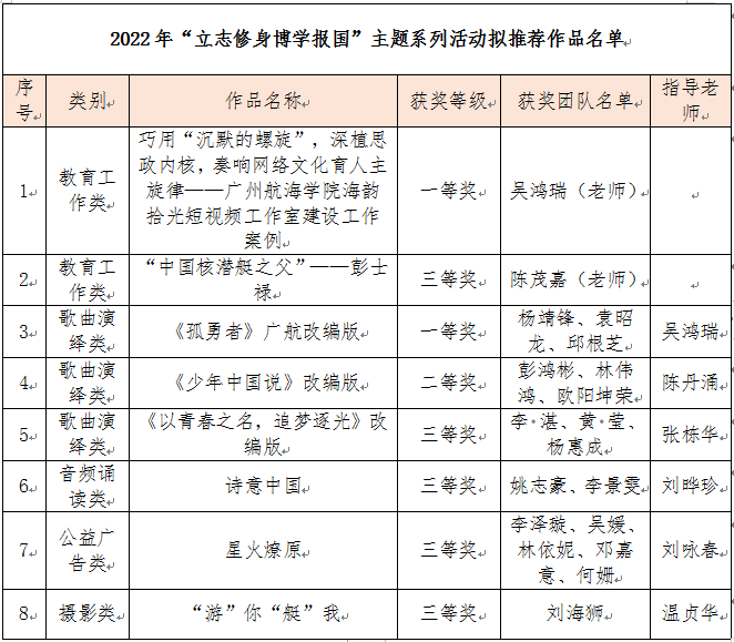 为深入贯彻落实习近平总书记关于高校思想政治工作的重要论述,增强大学生思想政治教育的针对性和吸引力,繁荣校园文化,积极发挥校园活动的育人作用,省教育厅面向全省高校组织开展了2022年“立志·修身·博学·报国”主题教育系列活动。活动共设置社会实践调研类、宣讲诵读类、歌曲演绎类、主题摄影类、公益广告类、教育工作类等6类项目。