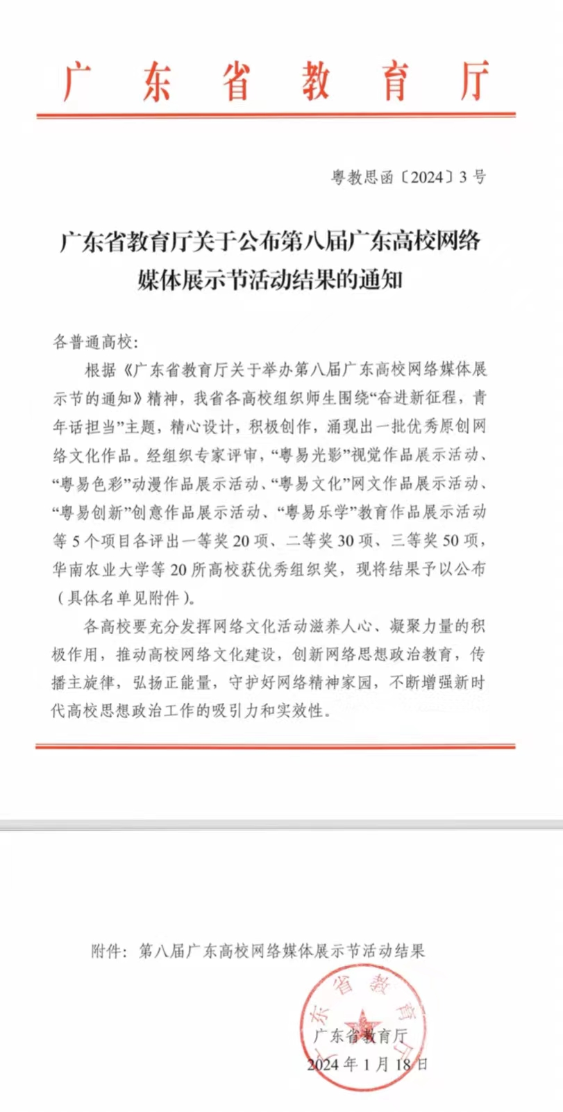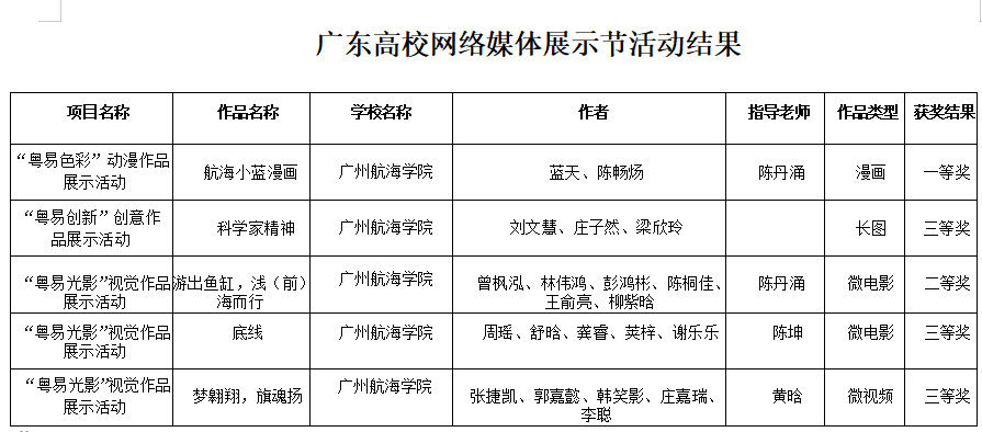 近日,广东省教育厅公布了第八届广东高校网络媒体展示节活动评选结果,m88师生作品获一等奖1项,二等奖1项,三等奖3项,累计获得5项奖励。
