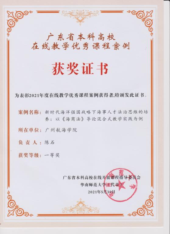 (海运学院供稿)日前,广东省本科高校在线开放课程指导委员会公布2021年广东省本科高校在线教学优秀课程案例获奖项目,m88海运学院海商法教研室陈石博士申报的线上线下混合式课程案例“新时代海洋强国战略下海事人才法治思维的培养:以《中华人民共和国海商法》导论混合式教学实践为例”荣获一等奖。