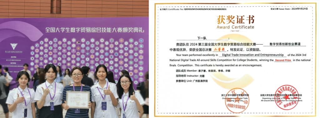 比赛过程中,团队成员熟练运用Excel、ERP等工具,在《数字贸易创新创业实战对抗平台》中,通过技术、服务、数品与订购贸易进行创业模拟,创新服务产品或商业模式等,凭借扎实的数贸知识和勇于创新的思维,不断尝试新的方法和策略,敢于挑战突破,提出了创新性的平台项目,展现出团队在数字贸易领域的专业素养和综合技能,彰显出广航学子团队协作和创新能力。其中,团队项目《CHINAROW中国行旅游服务平台》在点评环节中,更是受到了特别表扬。评委认为,团队的PPT制作精良,其项目内容契合大赛的主题“数字贸易、商通全球”。通过激烈的竞争和专业的评审,由m88海事法律与交通管理学院物流工程专业蔡子慧、林美琪、许敏、李维同学组成的“下一队”团队,在专业教师刘蓉的悉心指导下,从创新创业赛道华南赛区71支优秀团队中脱颖而出,获一等奖,成功晋级全国总决赛。在全国总决赛颁奖典礼宣传板上,广航校徽位于展板正中央,体现了m88高质量教育教学水平。